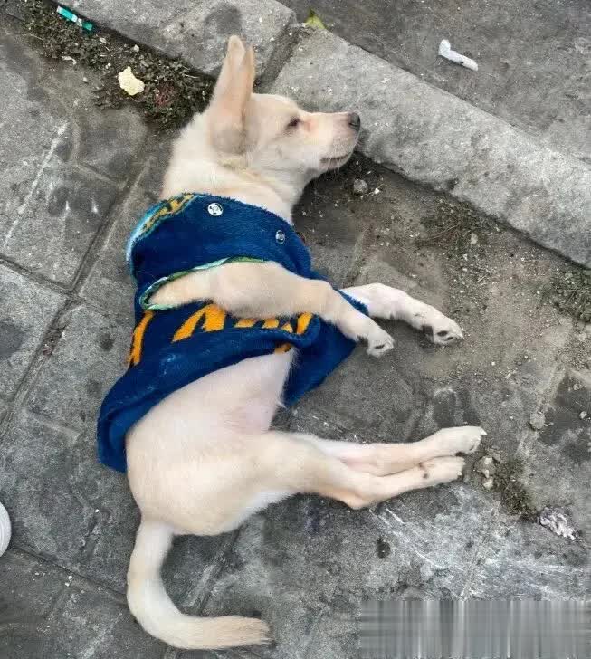 那天傍晚,我照例下楼倒垃圾,却在垃圾桶旁看见了一个小小的蓝色身影——那是一只一稔蓝色毛衣的小狗,安谧地侧躺在冰冷的水泥地上,像被谁渐忘的旧玩偶。