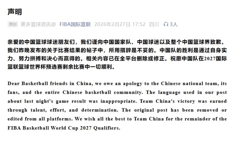 FIBA海外篮联发布声明:亲爱的中国篮球球迷一又友们,真钱三公app官方最新版下载咱们谨向中国国度队、中国球迷以及系数这个词中国篮球界致歉。咱们昨晚发布的对于比赛着力的帖子中,所用措辞是欠妥的。中国队的顺利是通过本人实力、悉力拼搏和决心而得回的。有关履行已在全平台删除或修正。祝福中国队在2027海外篮联篮球寰球杯预选赛剩余比赛中一切获胜。