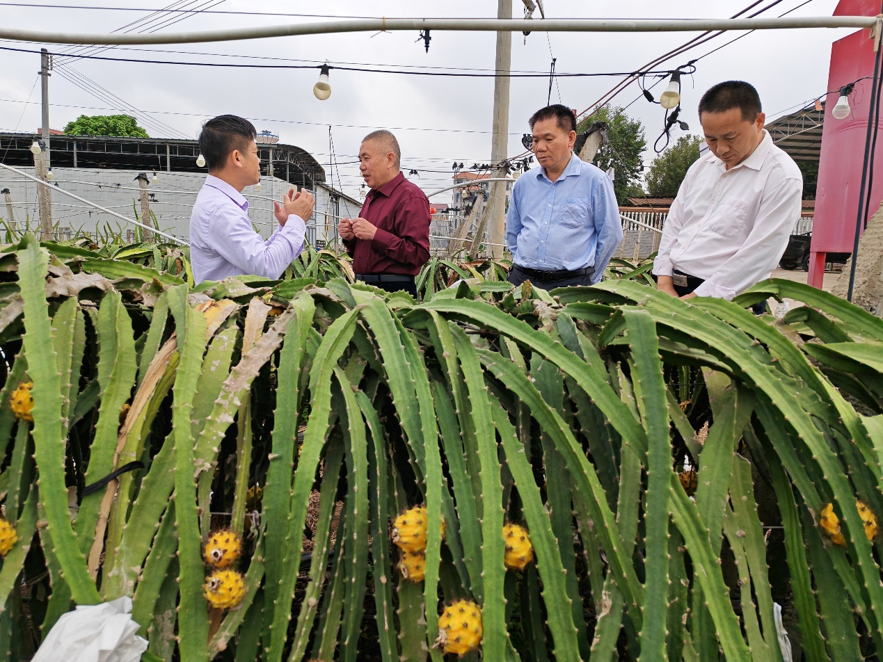 林红辉(左一)指导职责队在杨柑镇布政村调研火龙果产业发展成功。